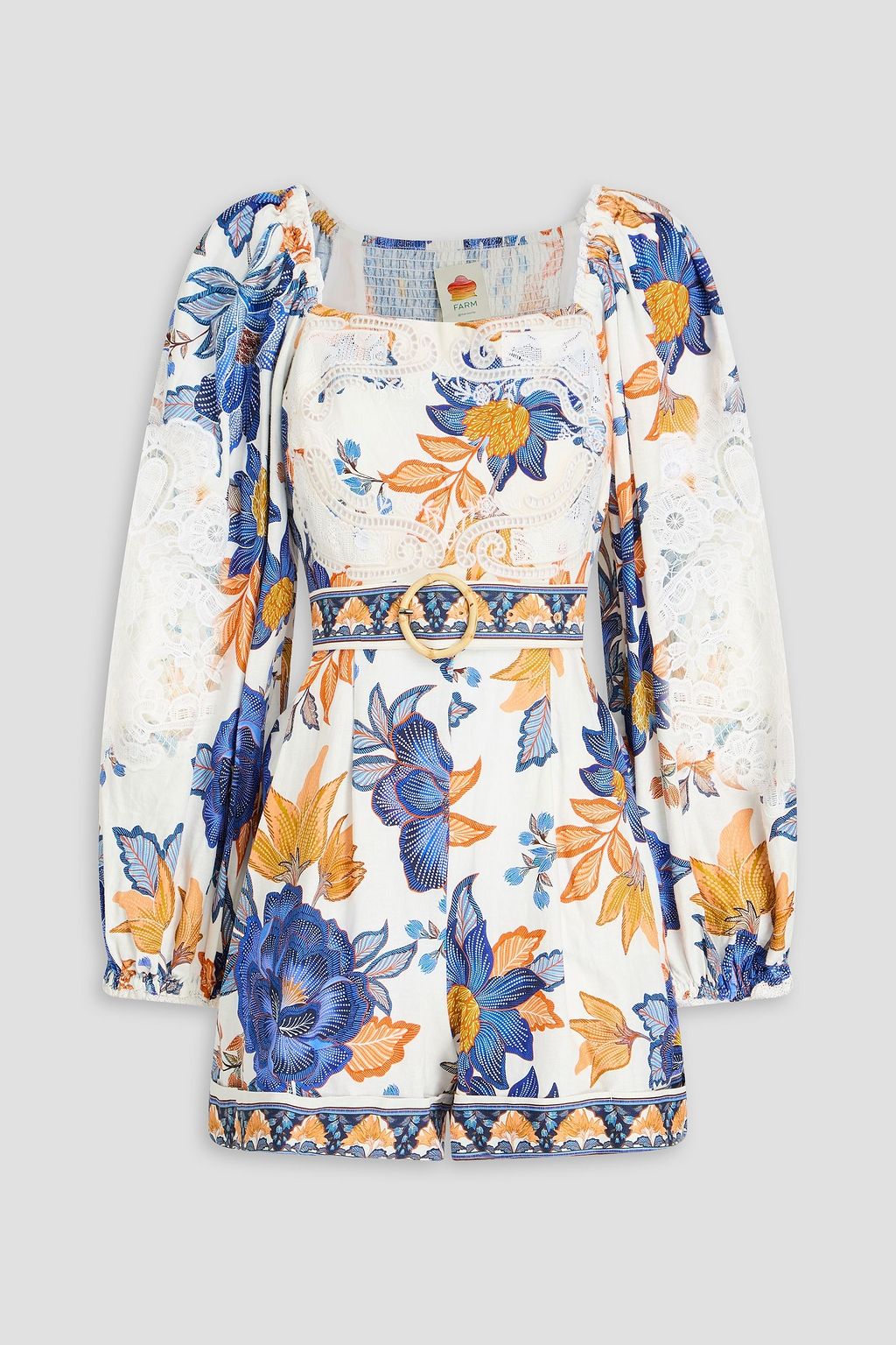 FARM RIO Lace-trimmed floral-print linen-blend playsuit