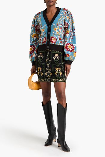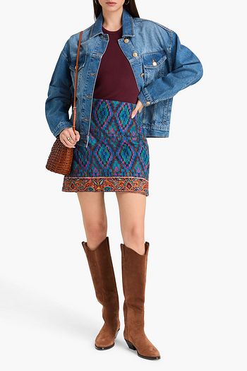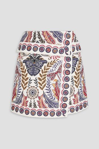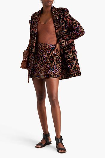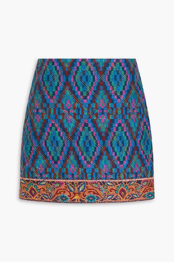 Bead-embellished tie-front printed metallic fil coupé mini skirt