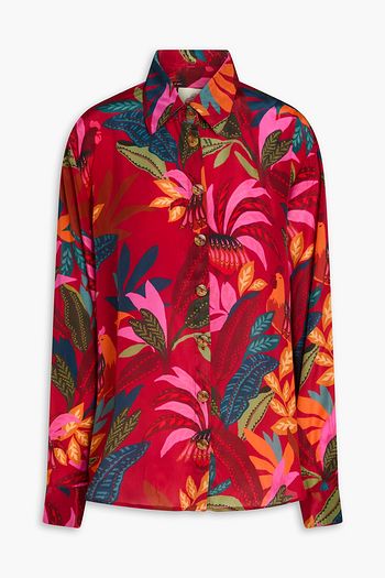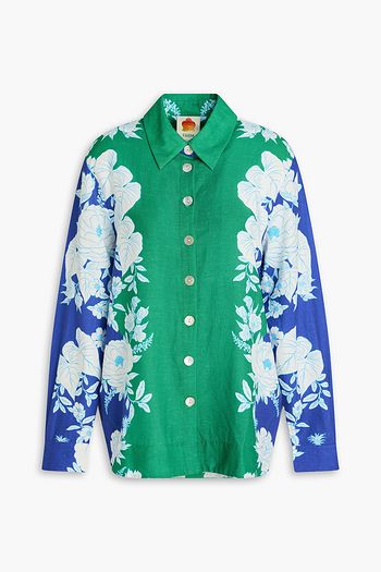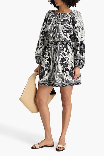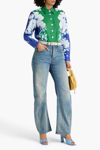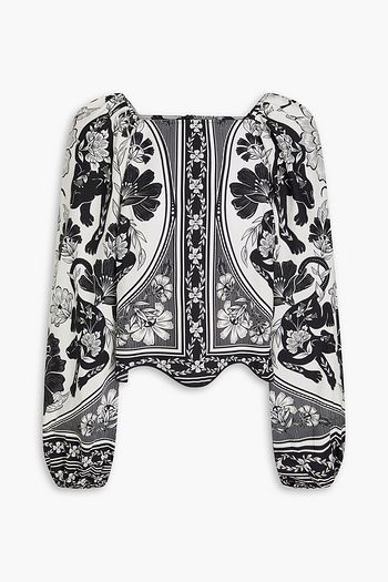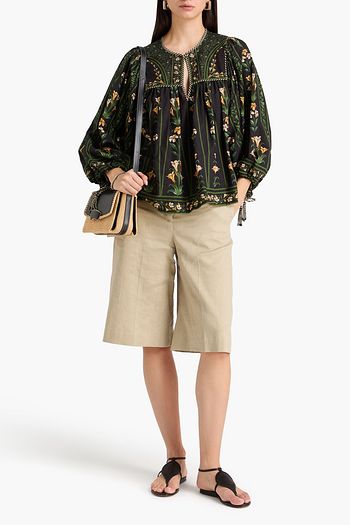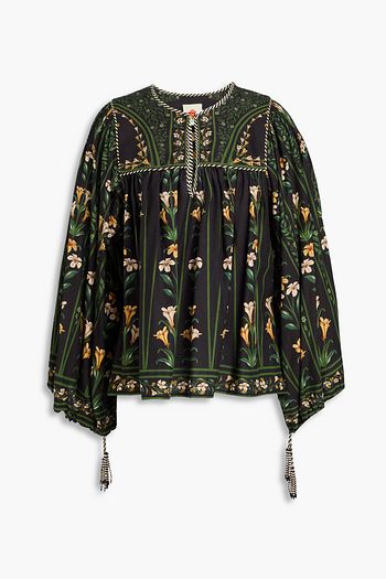 Lace-trimmed floral-print Swiss-dot cotton blouse