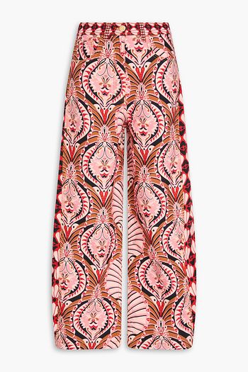 Cropped printed linen-blend wide-leg pants