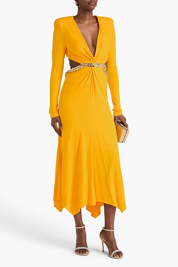 Lumiere off-the-shoulder crystal-embellished mesh midi dress