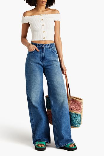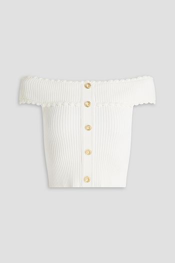 Off-the-shoulder cropped button-embellished ribbed-knit top