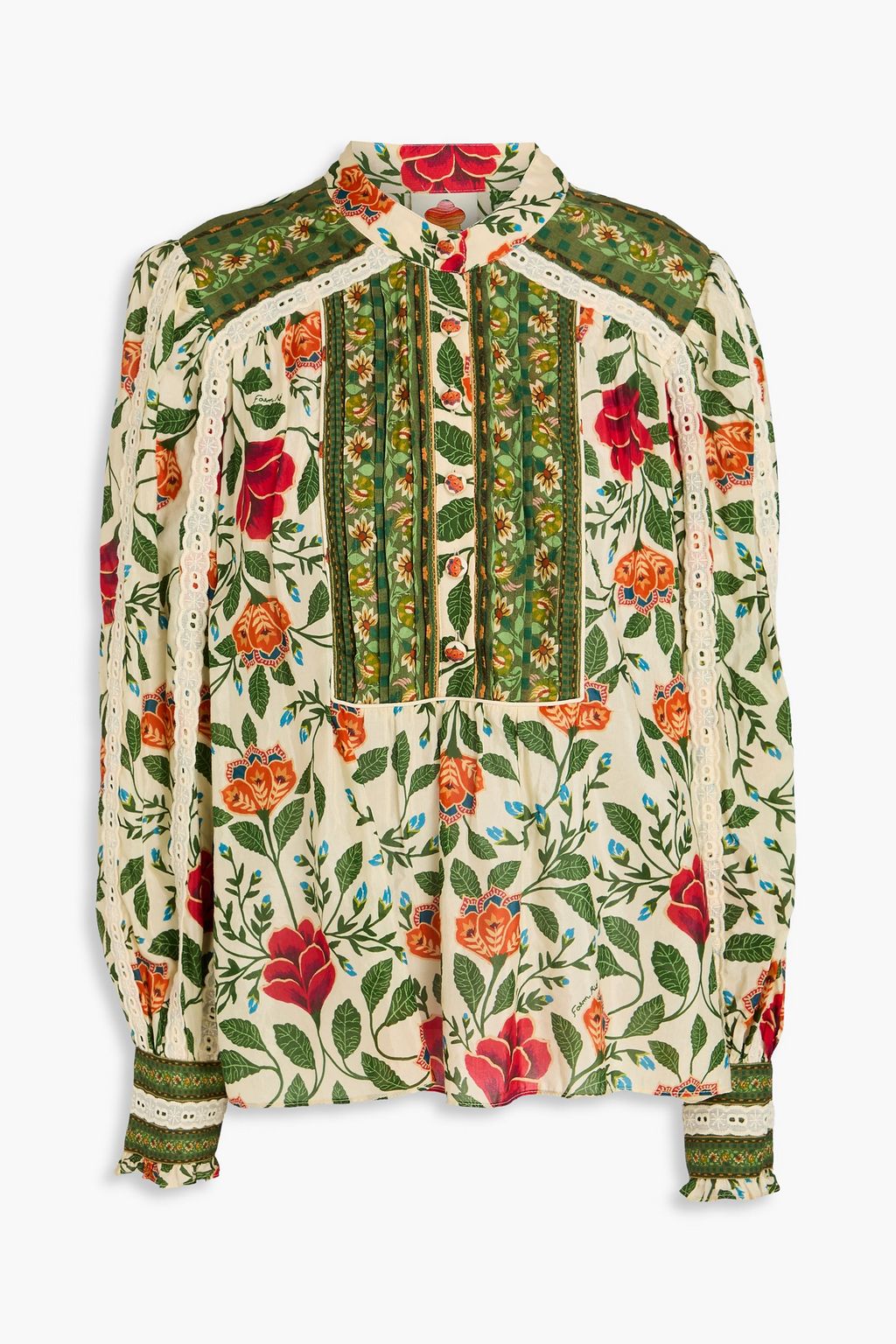 FARM RIO Lace-trimmed floral-print cotton-blend blouse