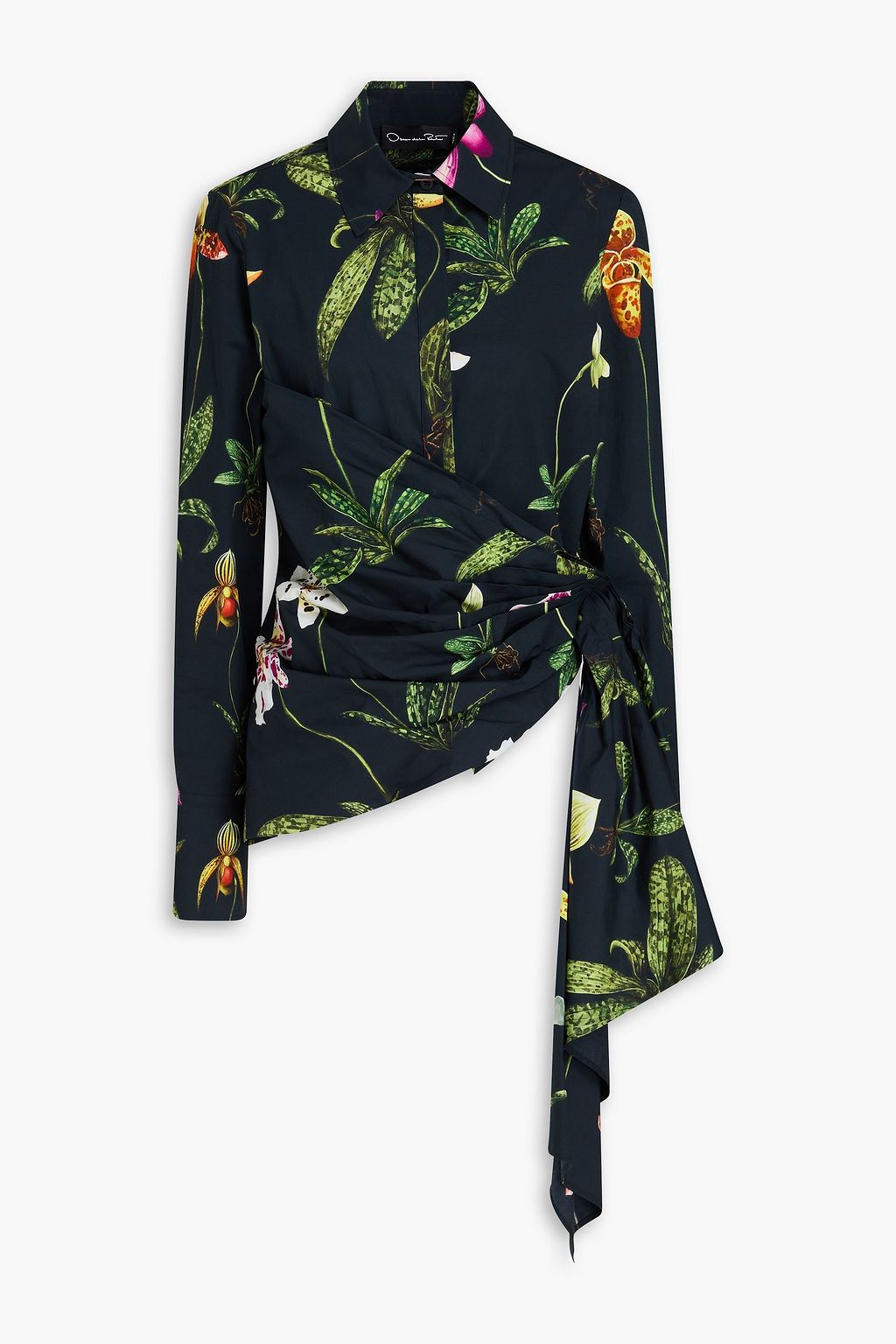 OSCAR DE LA RENTA Draped floral-print stretch-cotton poplin shirt