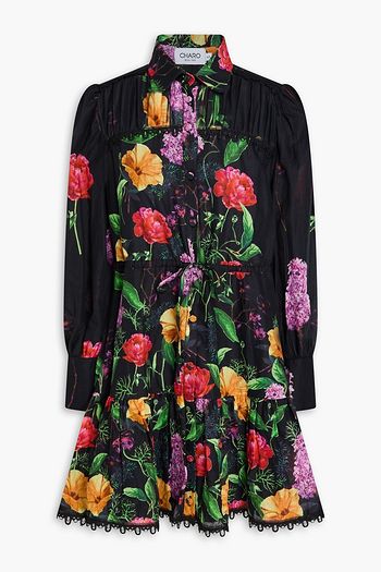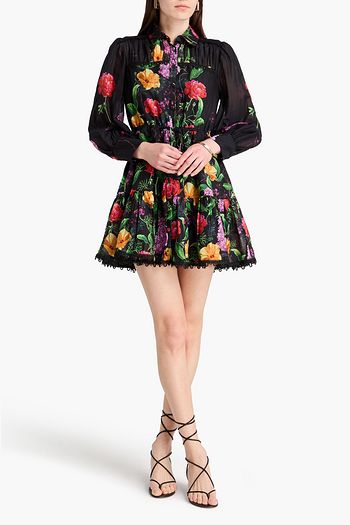 Crochet-trimmed floral-print cotton-blend mini shirt dress