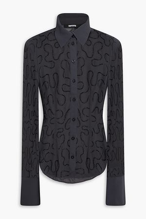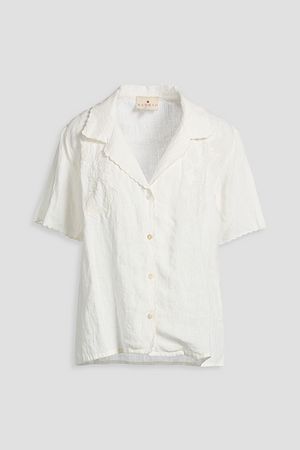 The brushstrokes might be yours: some chandelier earrings, a hot hue of lipstick or perhaps a brooch. (The latter approach was chosen by one of the earliest female white-shirt adopters, Katharine Hepburn in the 1938 film Holiday. Prior to that, no nice girls wore white blouses. Shirts were strictly for the boys.) Then again, the flourishes might be the shirt’s own: a ruffle, a flounce, a bow, embroidery, a bouffant shoulder or cuff; all of the above.