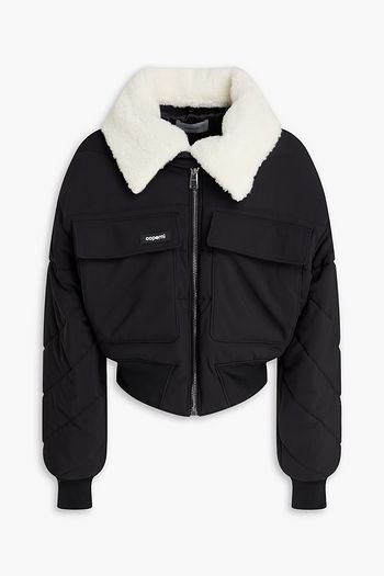 Fleece-trimmed quilted stretch-shell bomber jacket