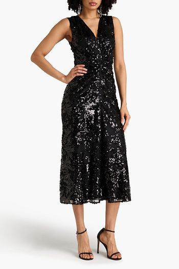Shirred printed crepe midi dress