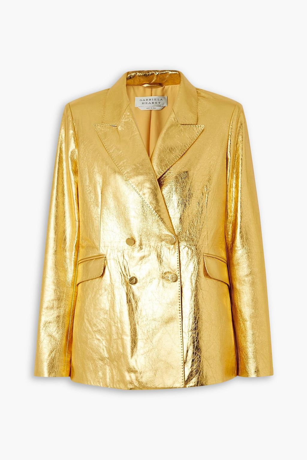 Gabriela Hearst's 'Angela' blazer ensures you’ll stand out in a crowded room. Made from glistening gold leather with a double-breasted front, it has a nipped in waist and broad shoulders that create a beautiful hourglass silhouette.