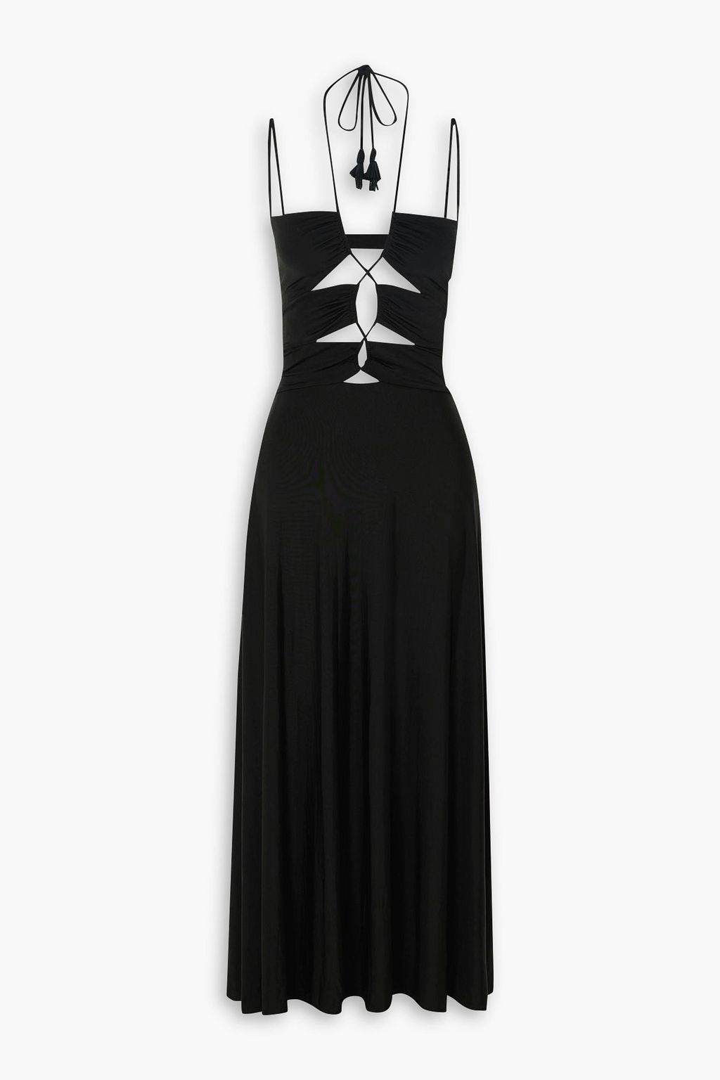 Johanna Ortiz's dress is laced with crossover straps that create delicate cutouts along the bodice. It’s made from lustrous stretch-jersey and has halterneck ties tipped with swishy tassels that fall elegantly down the back.