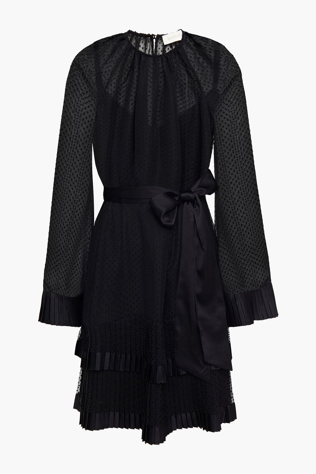 Tiered belted satin-trimmed fil coupé chiffon mini dress