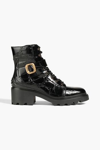 Embellished croc-effect leather ankle boots