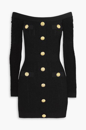 Off-the-shoulder embellished ribbed and open-knit mini dress