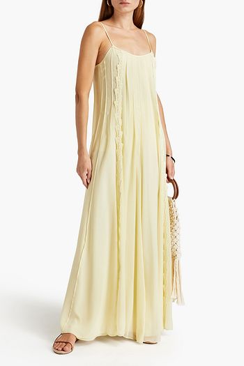 Fringed leather-paneled linen maxi dress