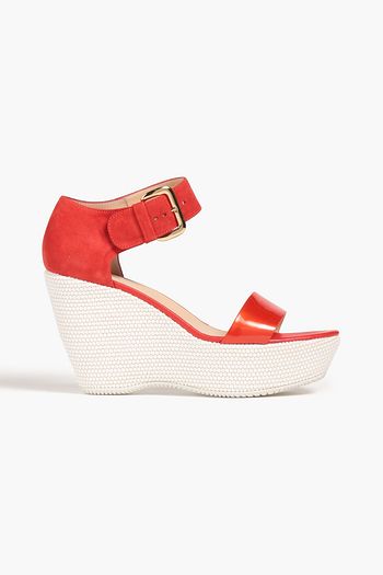 Suede-paneled glossed leather wedge sandals