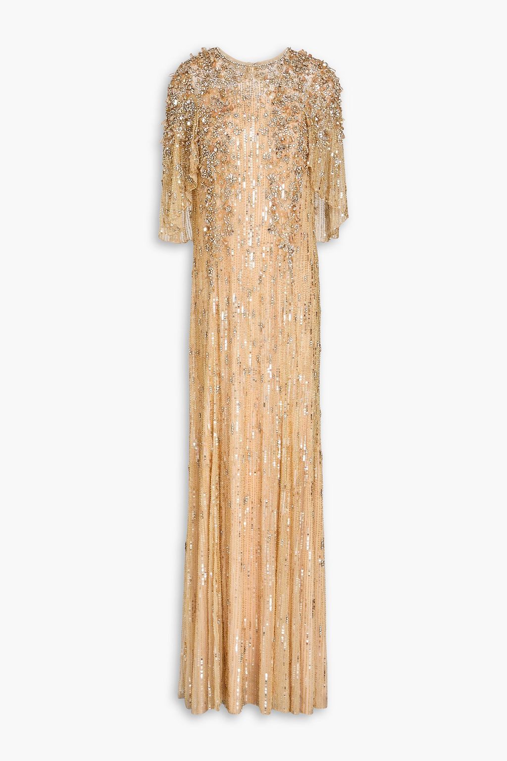 Catch eyes all night in this intricately embellished floor-sweeping design