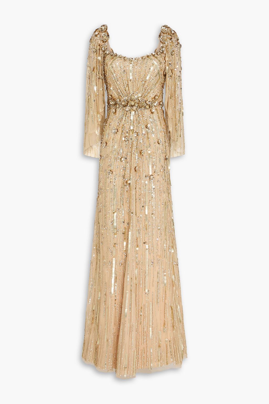 Catch eyes all night in this intricately embellished floor-sweeping design