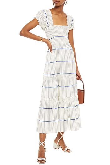Shirred striped cotton-blend poplin midi dress