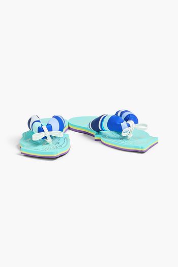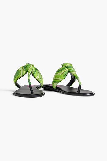 Bow-detailed printed padded jersey flip flops