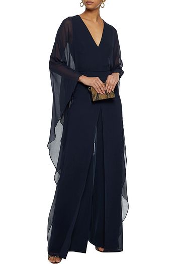 Tie-neck satin-paneled crepe wide-leg jumpsuit