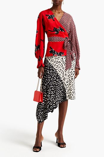 Patchwork-effect printed silk crepe de chine wrap blouse