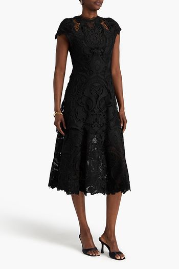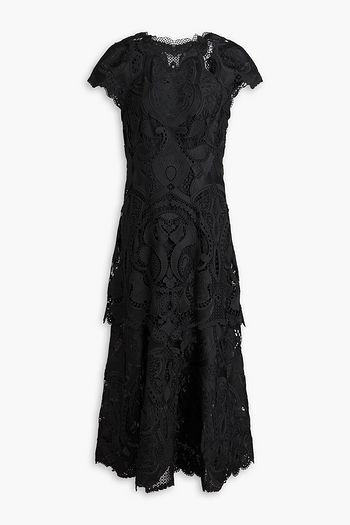 Tiered macramé lace-paneled cady midi dress