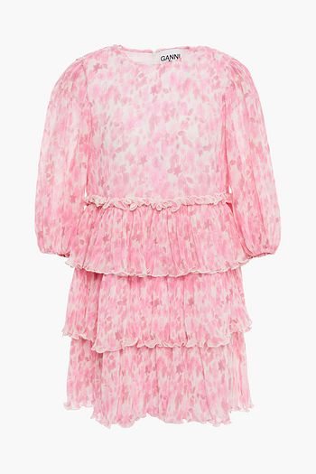 Ruffle-trimmed printed satin-crepe dress