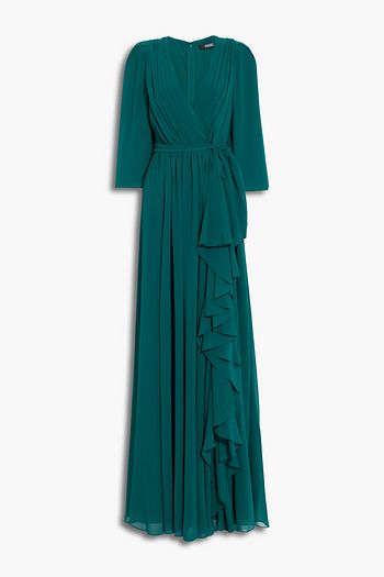 Wrap-effect pleated ruffled georgette gown
