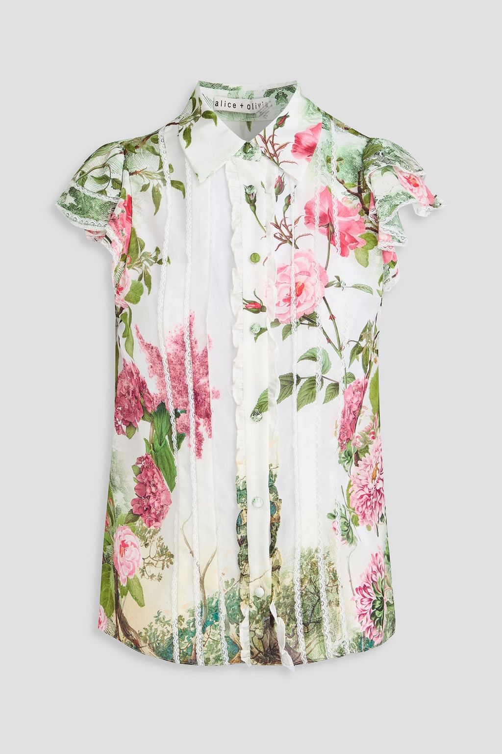 ALICE + OLIVIA Minda lace-trimmed floral-print crepe de chine shirt