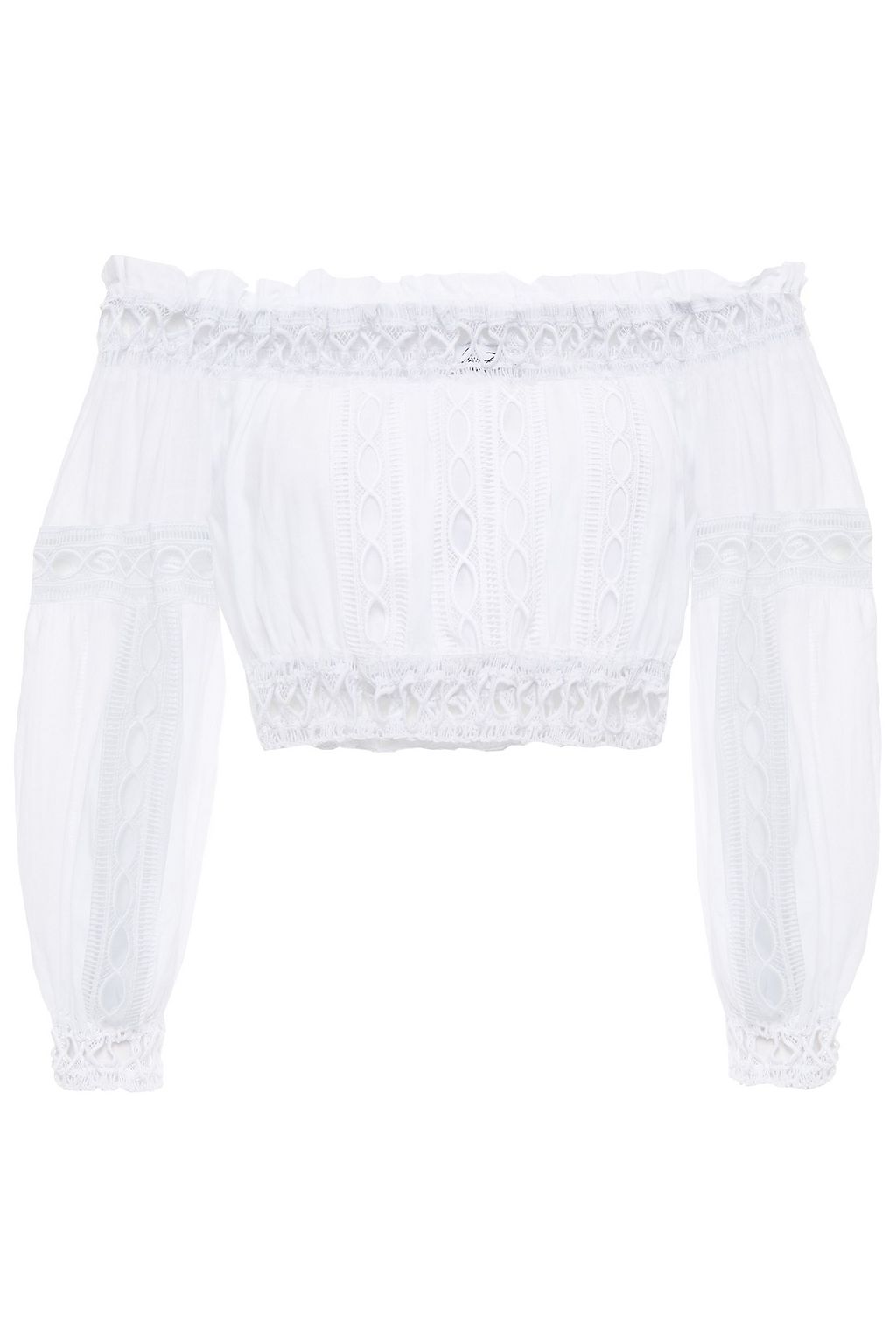 Alova cropped off-the-shoulder crocheted lace-trimmed cotton-blend voile top