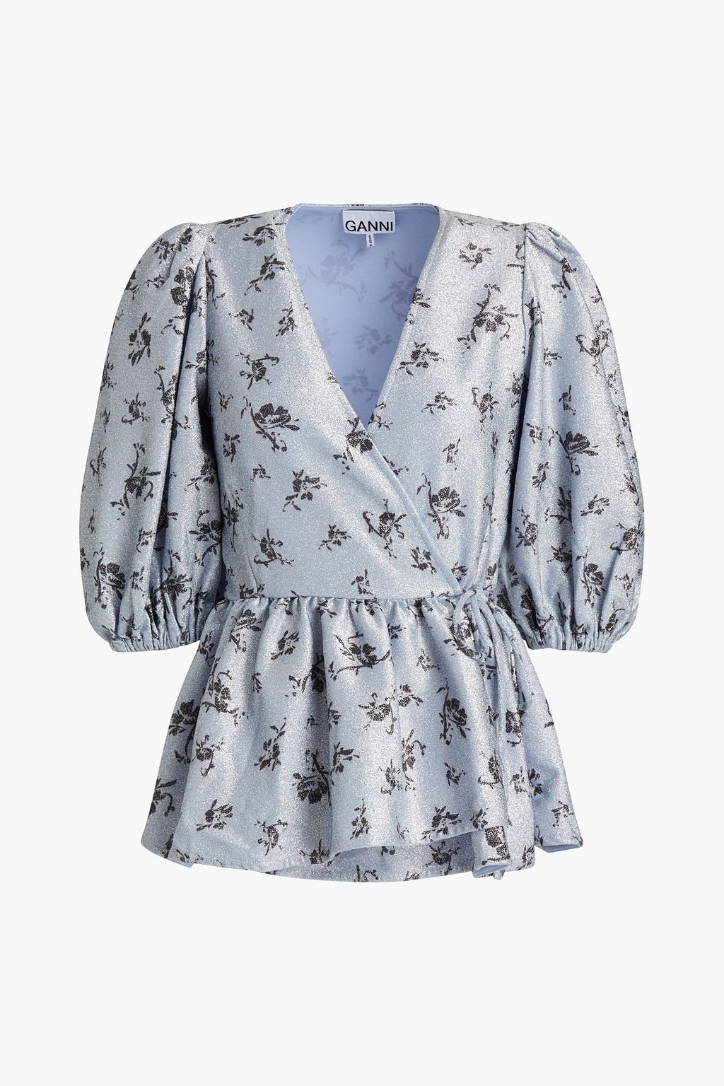 Printed metallic jersey wrap blouse