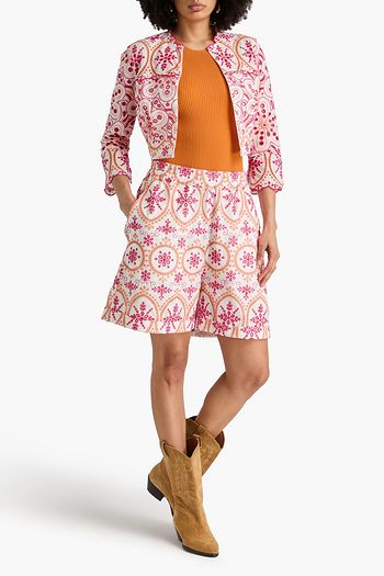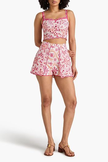 Shirred printed cotton-blend shorts