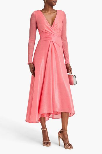 Wrap-effect metallic voile gown