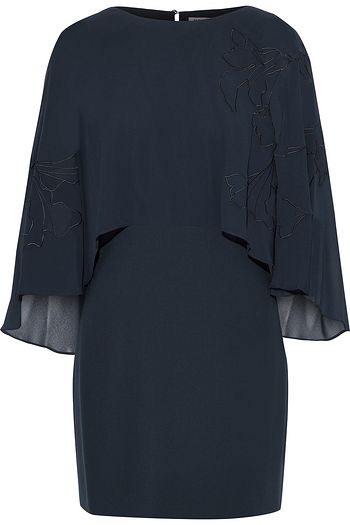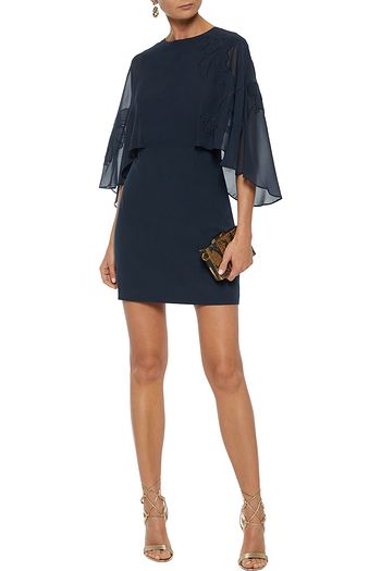 Cape-effect embroidered chiffon-paneled crepe mini dress