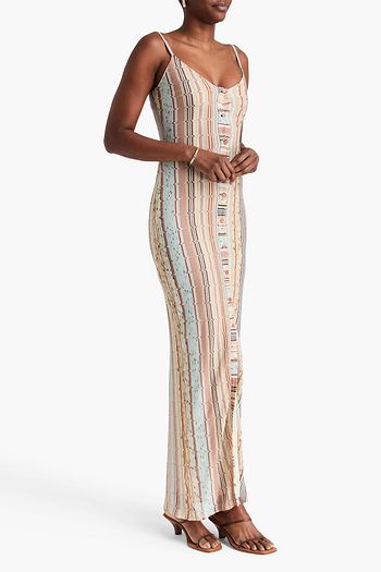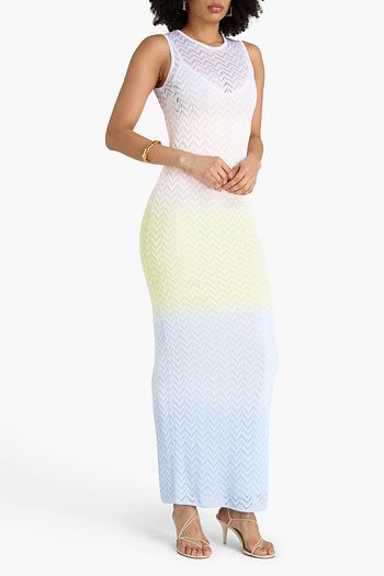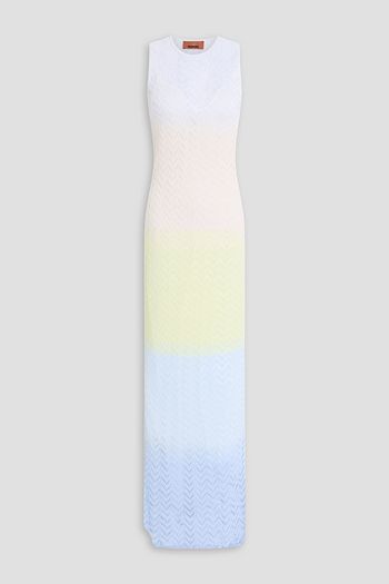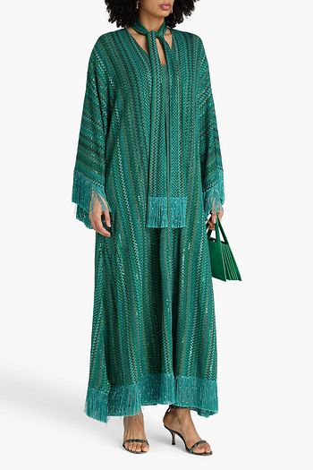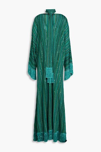 Fringed sequin-embellished metallic crochet-knit kaftan