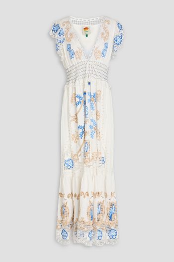 Crochet-trimmed printed linen-blend midi dress