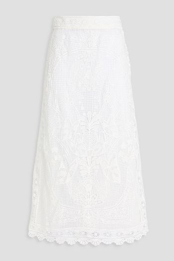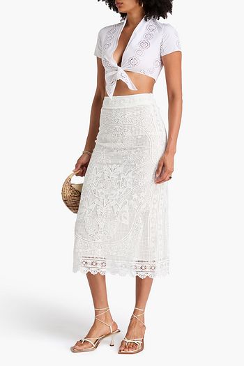 Pleated lace-trimmed crepon midi skirt