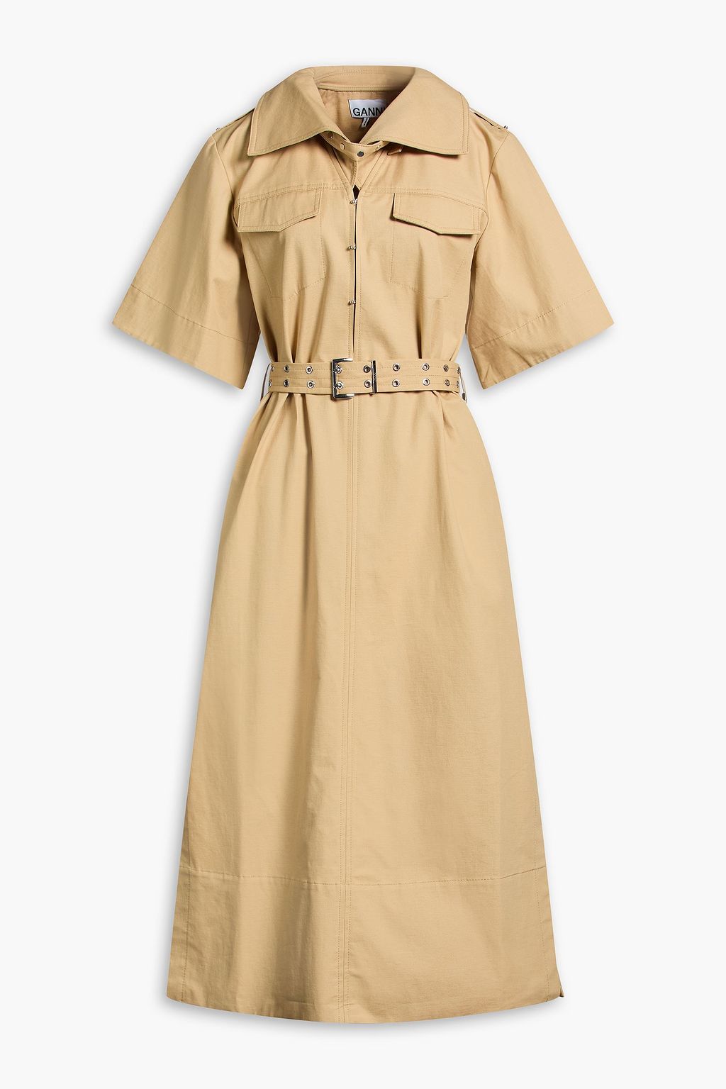 GANNI Belted cotton and linen-blend twill midi shirt dress