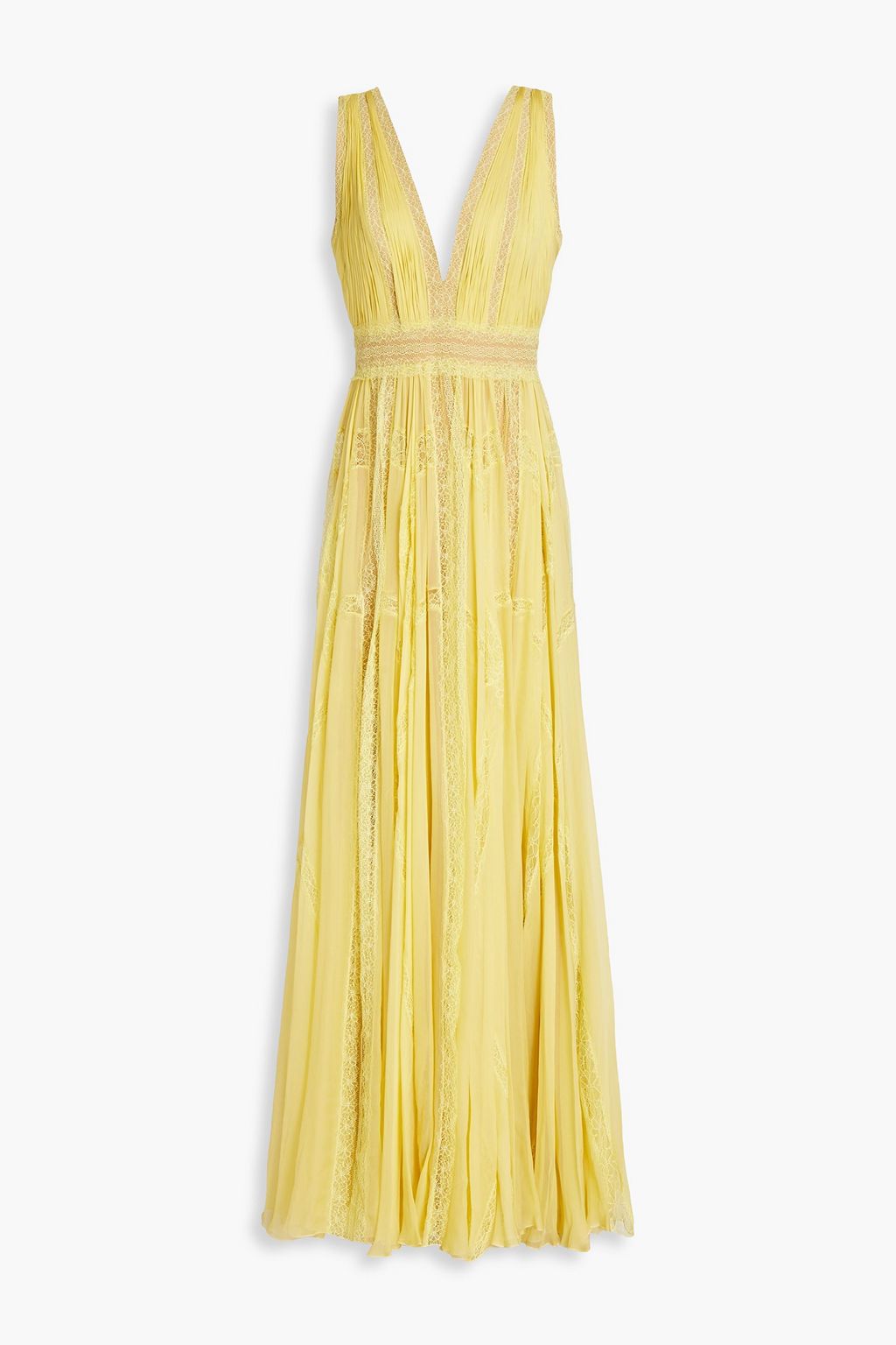 Gathered lace-trimmed silk-chiffon gown