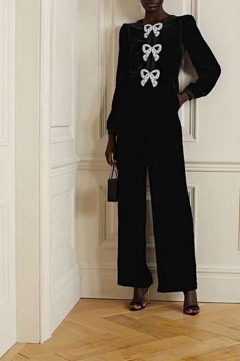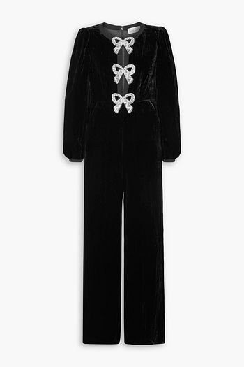 Fringed embellished printed velvet jumpsuit