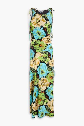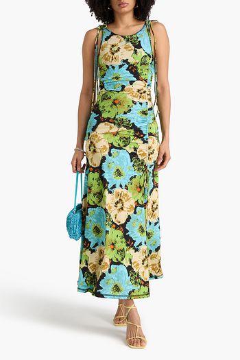 Ruched floral-print stretch-mesh maxi dress