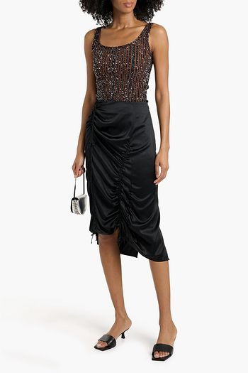 Knit-paneled gathered floral-print silk blouse