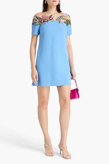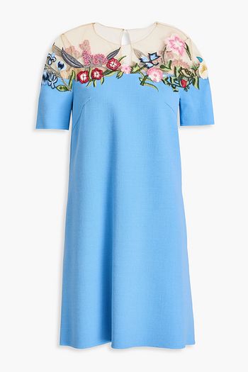 Embroidered tulle-trimmed wool-blend crepe mini dress