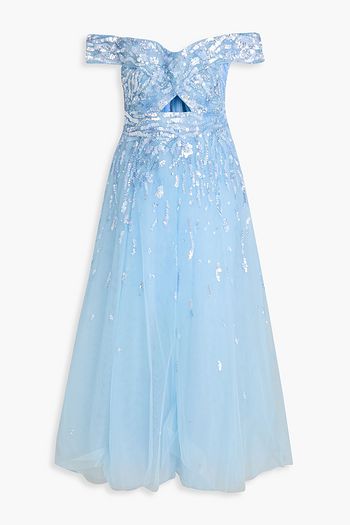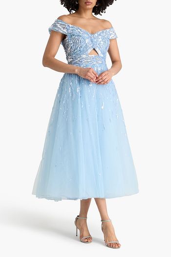 Off-the-shoulder embellished cutout tulle midi dress
