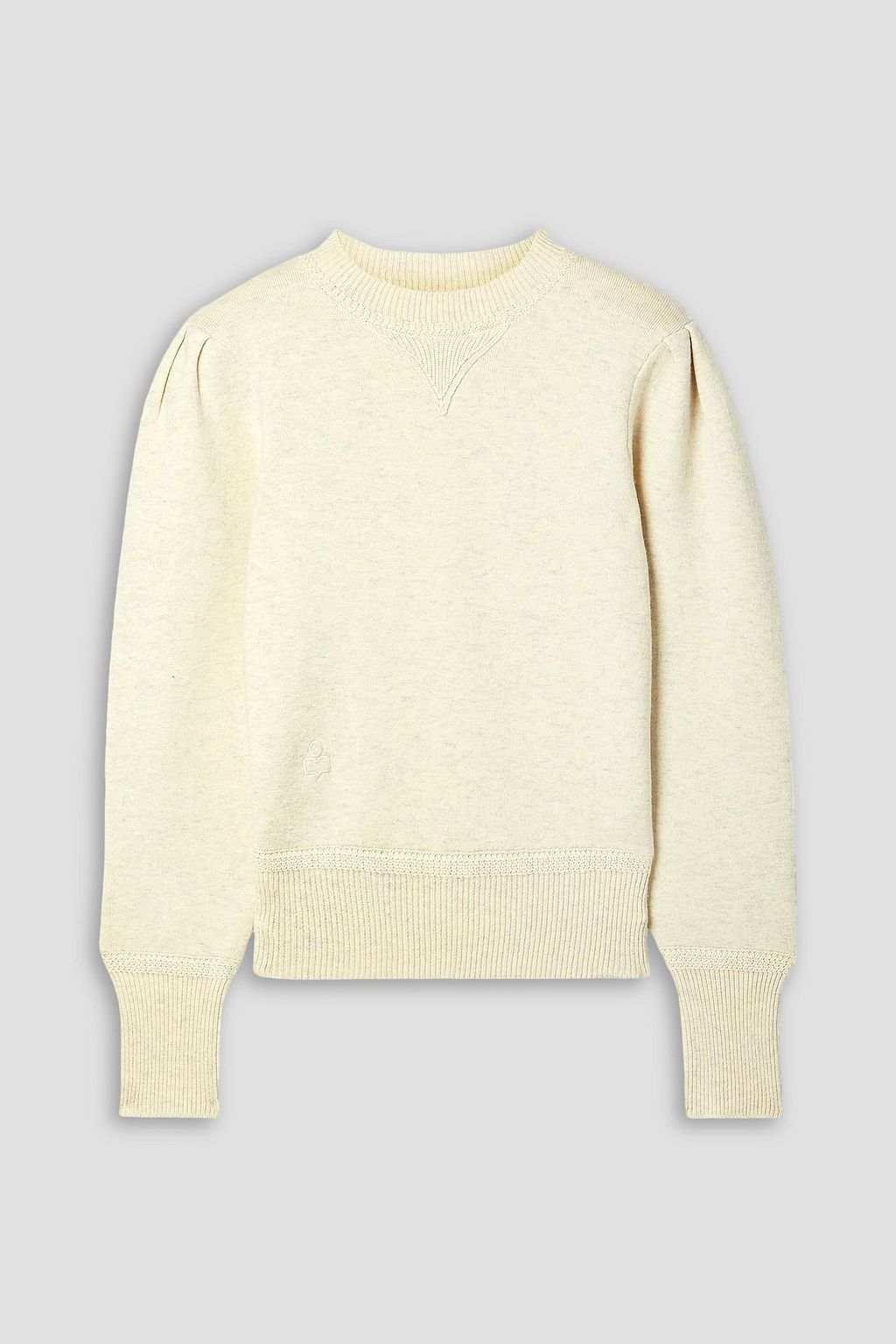 With V stitching at the neckline, Marant Étoile's 'Kelaya' sweater riffs on humble sports sweatshirts. It's knitted with plenty of cotton in a versatile cream and light-gray mélange and gathered at the sleeves to create the designer's signature puffed silhouette.