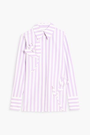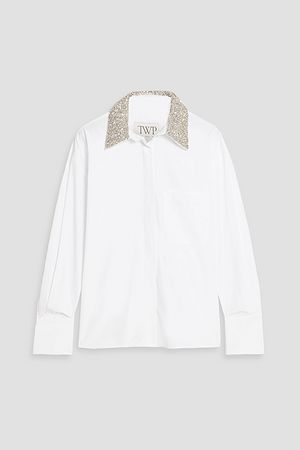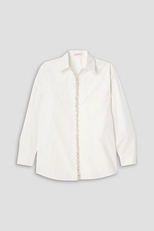 The brushstrokes might be yours: some chandelier earrings, a hot hue of lipstick or perhaps a brooch. (The latter approach was chosen by one of the earliest female white-shirt adopters, Katharine Hepburn in the 1938 film Holiday. Prior to that, no nice girls wore white blouses. Shirts were strictly for the boys.) Then again, the flourishes might be the shirt’s own: a ruffle, a flounce, a bow, embroidery, a bouffant shoulder or cuff; all of the above.