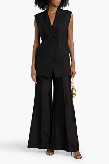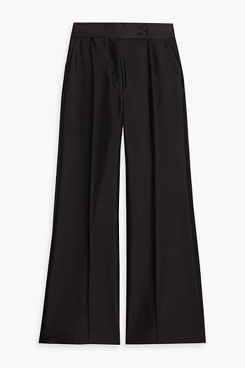 Pleated satin-trimmed wool-crepe straight-leg pants