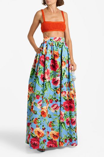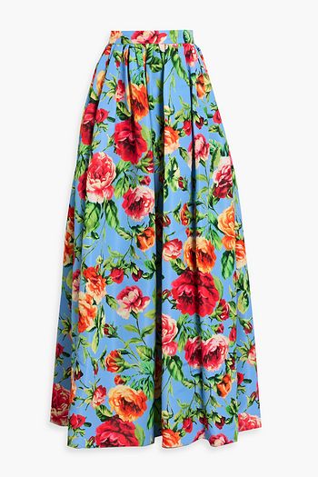 Pleated floral-print faille maxi skirt