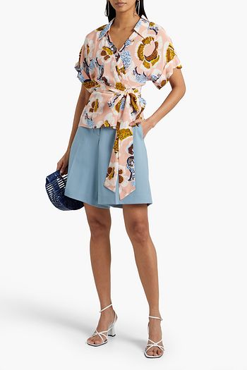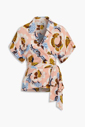 Printed washed-silk wrap top