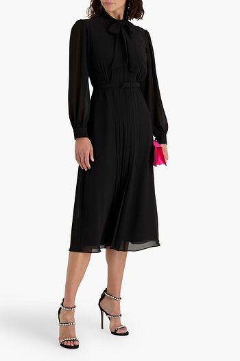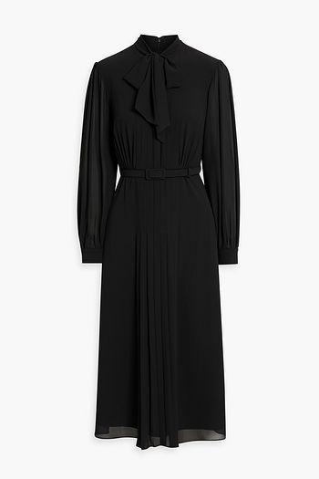Pussy-bow belted crepe de chine midi dress